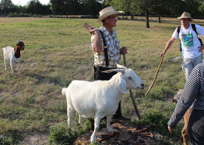 | Bill with his goat Olympia standing at his grandpa's home site |